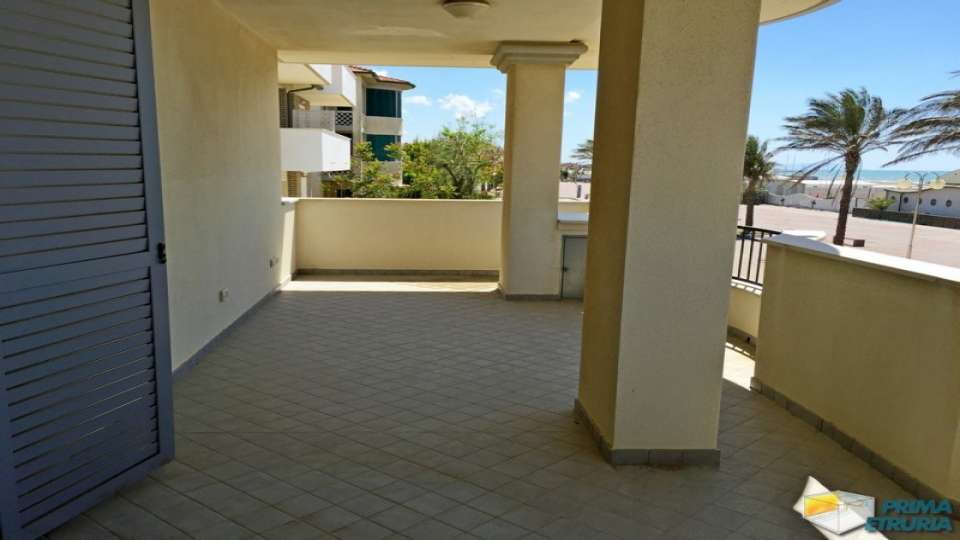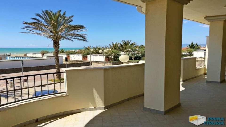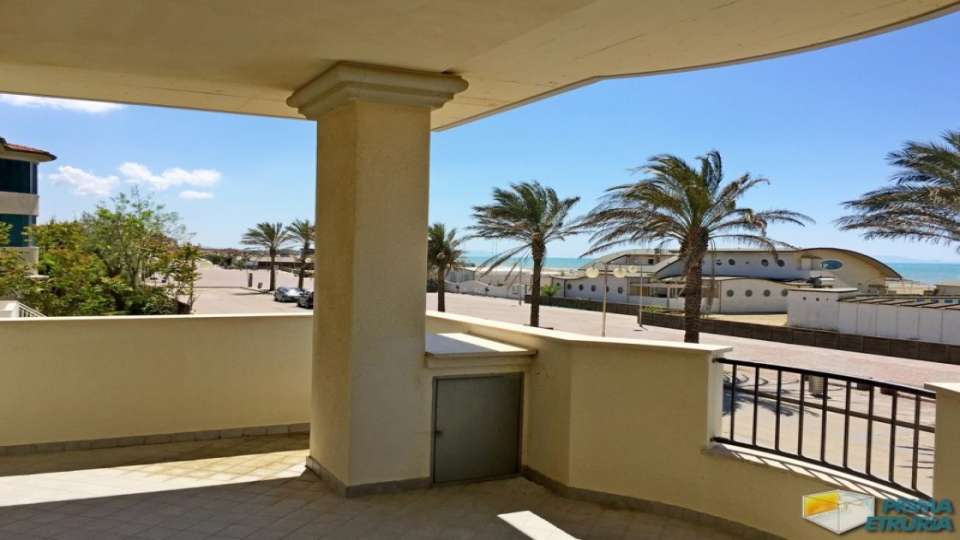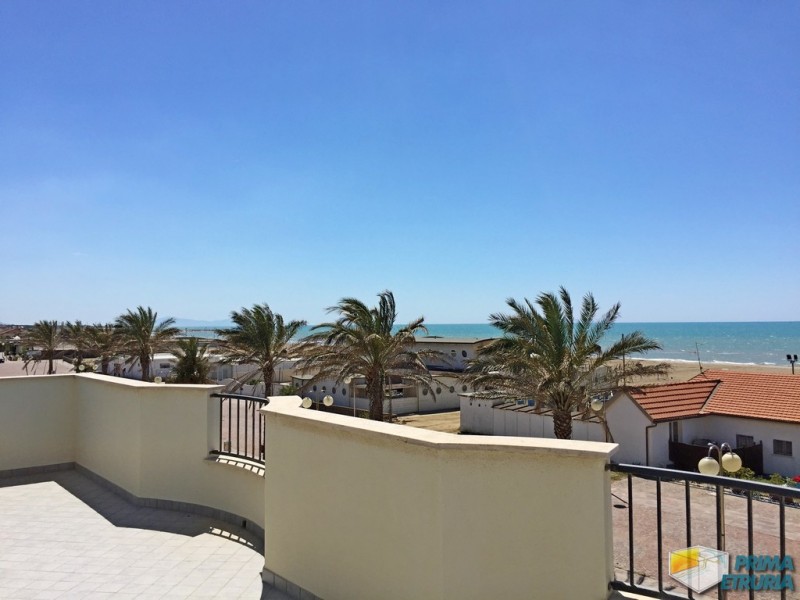 A MARINA DI GROSSETO IN VIA LUNGOMARE LEOPOLDO , A CIRCA 20 METRI DALLA SPIAGGIA , IN ZONA ROSMARINA , PROPONIAMO IN AFFITTO BELLISSIMO ATTICO FRONTE MARE SU DUE LIVELLI , POSTO AL PIANO PRIMO DI UNA ELEGANTE PALAZZINA DI RECENTE COSTRUZIONE . APPARTAMENTO COMPOSTO DA SOGGIORNO LIVING CON DIVANO LETTO MATRIMONIALE , CUCINOTTO , SALA DA PRANZO , BAGNO DI SERVIZIO E UNA VERANDA VISTA MARE ATTREZZATA CON TAVOLO E SEDIE ; SCALA INTERNA PER ACCEDERE AL PIANO SUPERIORE COMPOSTO DA BAGNO E DUE CAMERE MATRIMONIALI UNA DELLE QUALI SERVITA DA AMPIA VERANDA SOLARIUM CON UNA BELLISSIMA VISA SUL MARE . DOTATO DI TV , LAVATRICE E ARIA CONDIZIONATA . ARRIVO SABATO ORE 17:00-19:30 / PARTENZA ORE 08:00-10:00 . ANIMALI NON AMMESSI . COSTI AGGIUNTIVI : PULIZIE FINALI EURO 120,00